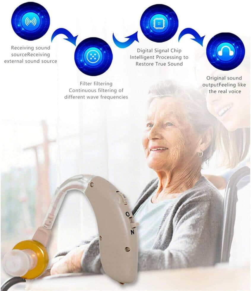 • Confort: Nuestro amplificador de sonido es muy adecuado para las orejas masculinas y femeninas. Son pequeños de tamaño, luz en plumas, y pueden usarse cómodamente durante todo el día.