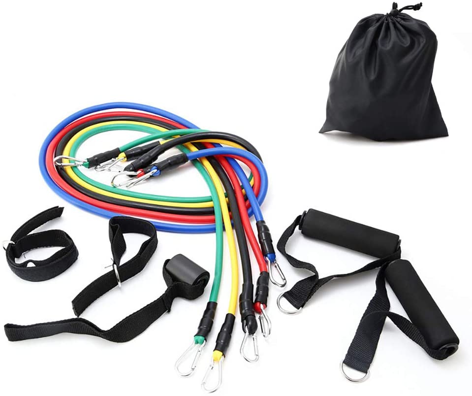 3. 11 PIEZAS EN 1 SET — Bcuerda elástica multicolor kit de gym para, con 5 bandas de resistencia(Diferentes colores, diferentes resistencias), 2 antideslizante asas, 2 correas de tobillo, 1 ancla para puerta y 1pcs llevar bolsa de regalo. Se pueden utilizar una o varias bandas de resistencia al mismo tiempo con el fin para obtener el grado de tensión deseado.