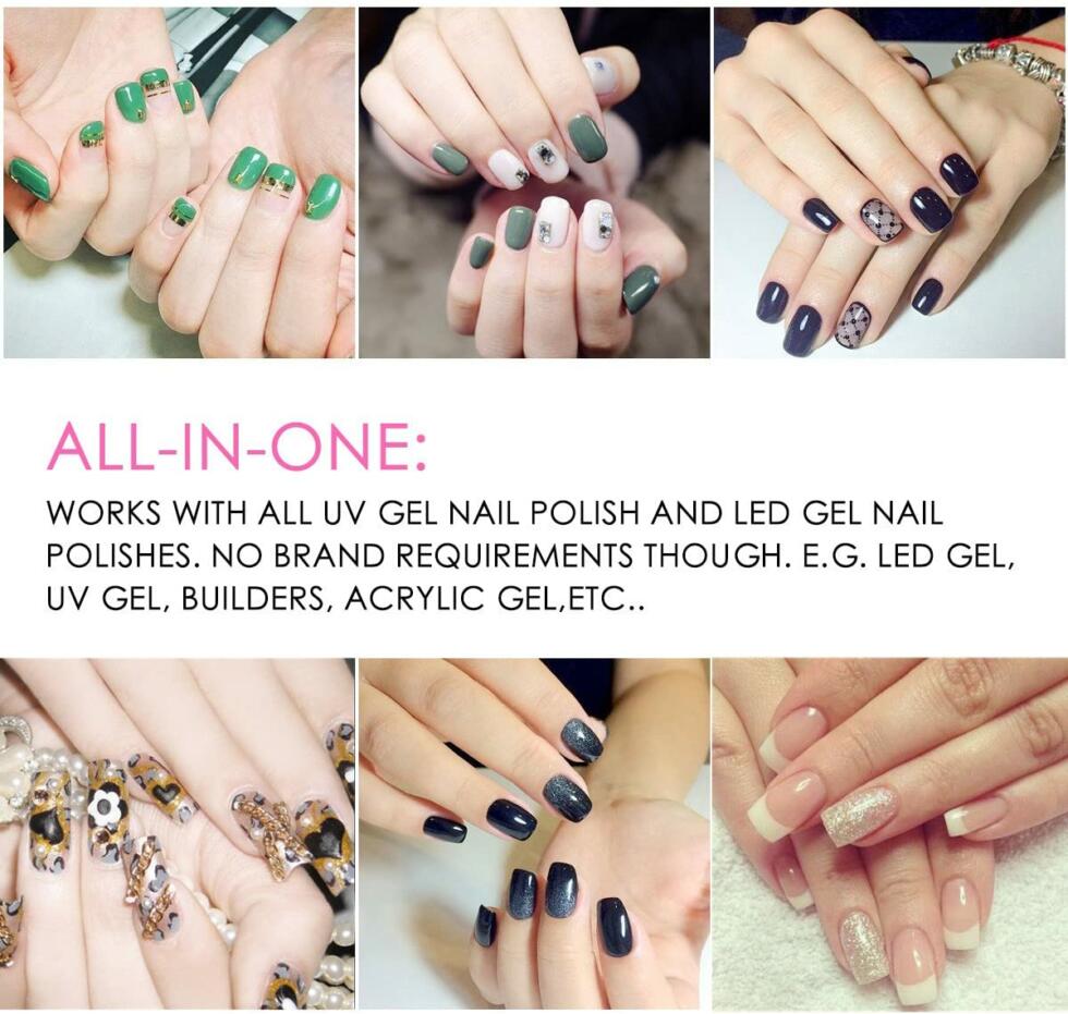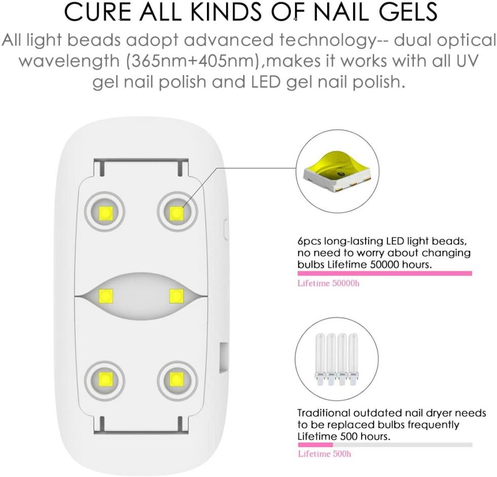 Curar todos los tipos de los geles de uñas: -Todos los granos de luz adoptan tecnología avanzada. Longitud óptica dual de onda (365nm+405nm), funciona con todo el esmalte de uñas de gel UV y el esmalte de uñas de gel LED,incluido Builder, geles duros,escultura gel, pegamento de gemas,escultura gel y mucho mas. No hay requisitos de la marca. No hace falta preocuparse cambiar las bombillitas.